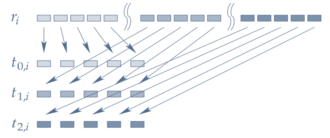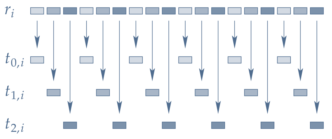 As shown in the following figure, in block splitting the sequence of an RNG is divided into equally-sized consecutive blocks that are generated by different threads: